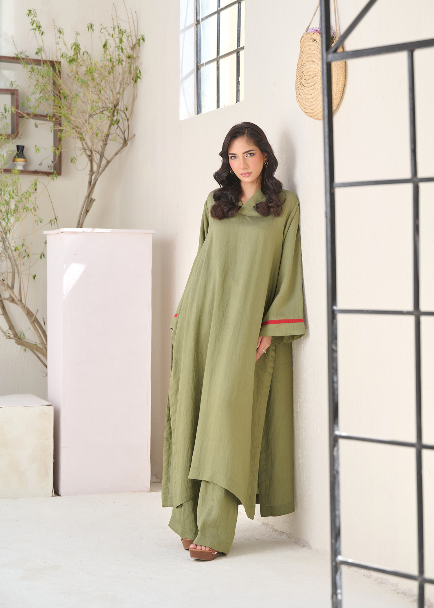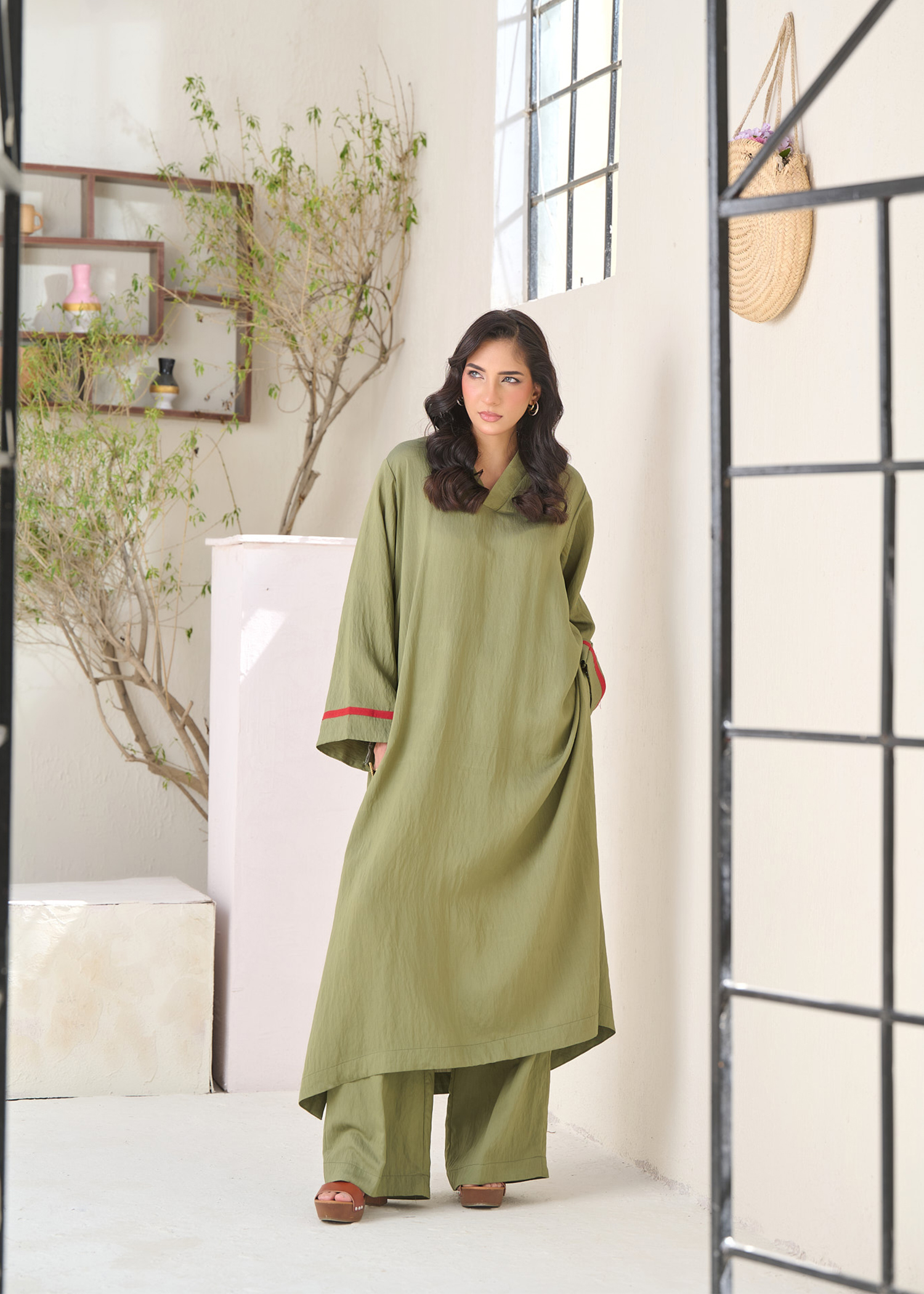 In crushed cotton viscose ,a flowing olive green kaftan cut shirt with contrast piping details on the sleeves and back,accentuated with an embroidered motif to complete the look.It is paired with wide leg pants.